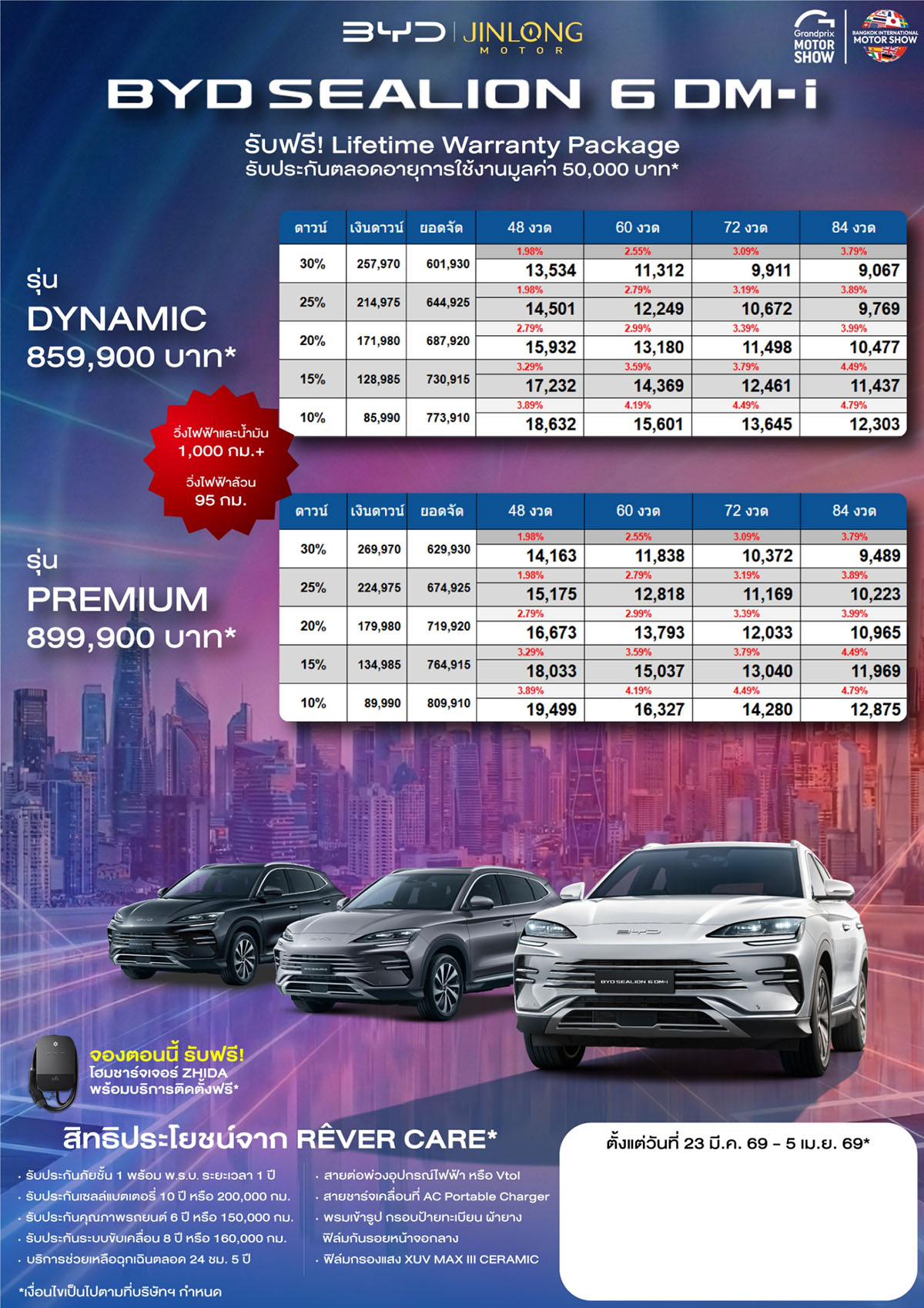 ราคาและตารางผ่อน BYD SEALION 6 DM-i ตั้งแต่วันที่ 23 มี.ค. 69 – 5 เม.ย. 69*