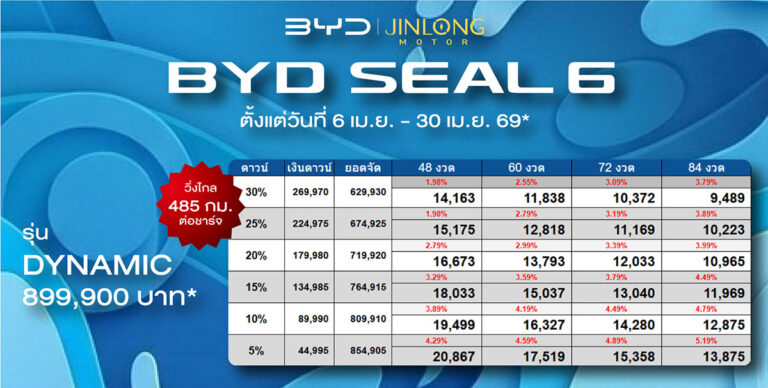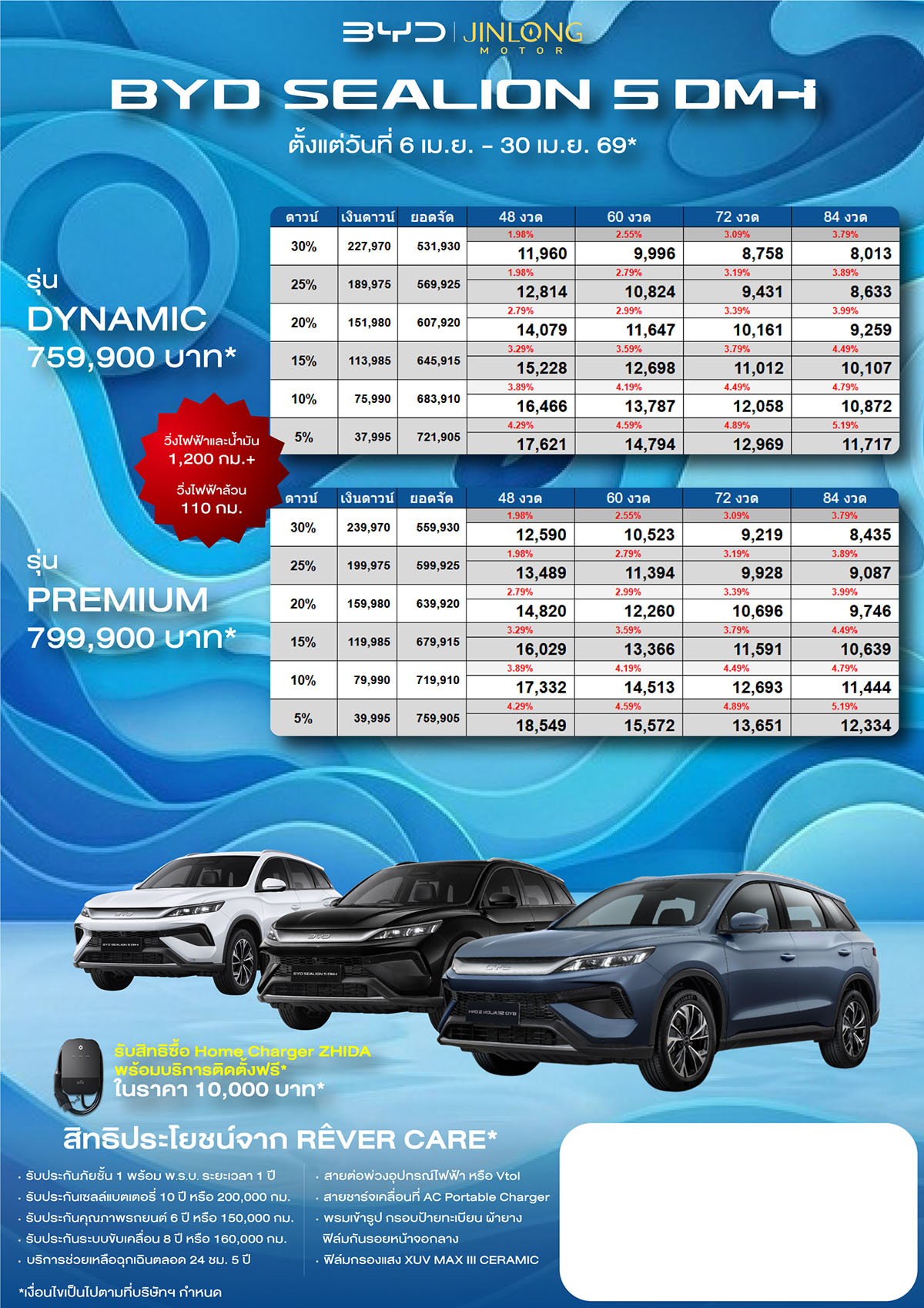 ราคาและตารางผ่อน BYD SEALION 5 DM-i ตั้งแต่วันที่ 6 เม.ย. 69 – 30 เม.ย. 69*