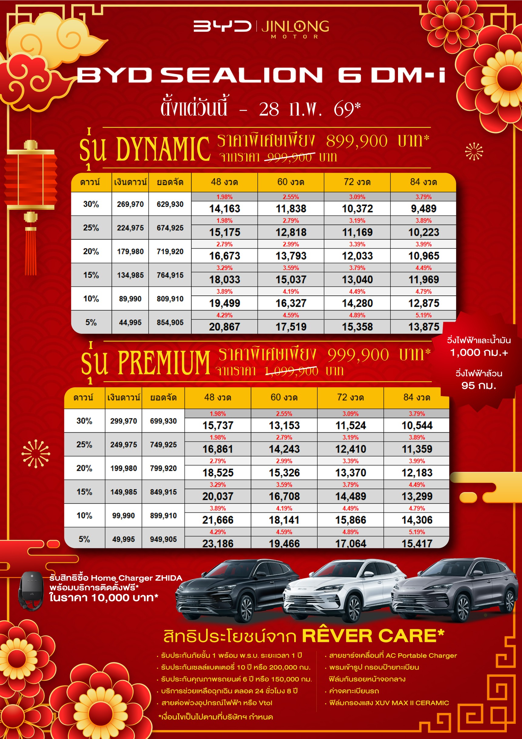 ราคาและตารางผ่อน BYD SEAL 6 ตั้งแต่วันที่ 23 มี.ค. 69 – 5 เม.ย. 69*
