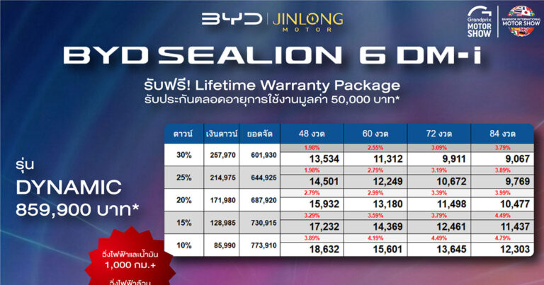 ราคาและตารางผ่อน BYD SEALION 6 DM-i ตั้งแต่วันที่ 23 มี.ค. 69 – 5 เม.ย. 69*