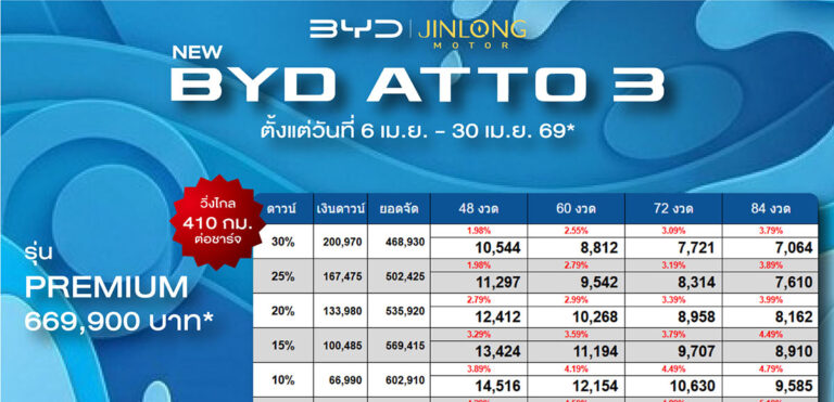 ราคาและตารางผ่อน NEW BYD ATTO 3 ตั้งแต่วันที่ 6 เม.ย. 69 – 5 เม.ย. 69
