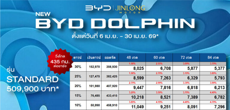 ราคาและตารางผ่อน NEW BYD DOLPHIN ตั้งแต่วันที่ 6 เม.ย.69 – 30 เม.ย.69*