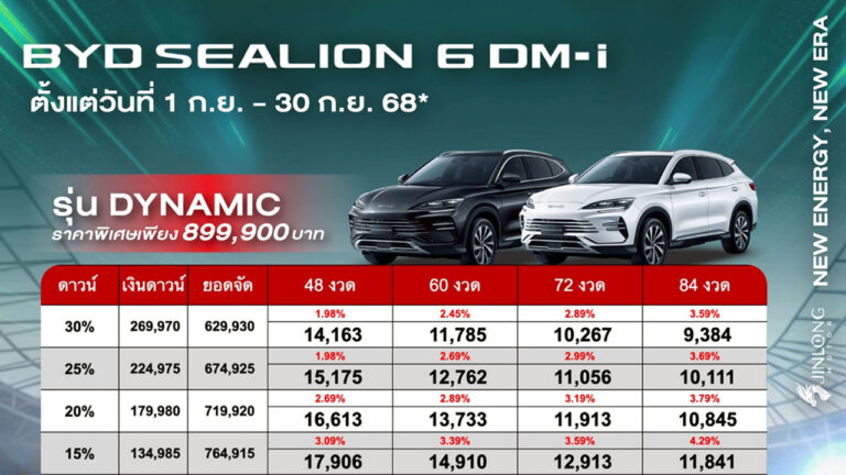 ราคาและตารางผ่อน BYD SEALION 6 DM-i ตั้งแต่วันที่ 1 - 30 กย. 68 บีวายดี จินหลง สาขาแจ้งวัฒนะ