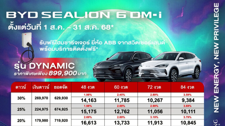 ราคาและตารางผ่อน BYD SEALION 6 DM-i ตั้งแต่วันที่ 1 สค. - 31 สค. 68 บีวายดี จินหลง สาขาแจ้งวัฒนะ