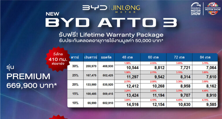 ราคาและตารางผ่อน BYD ATTO 3 ตั้งแต่วันที่ 23 มี.ค. 69 – 5 เม.ย. 69