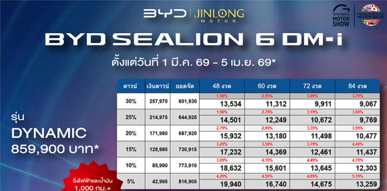 ราคาและตารางผ่อน BYD SEALION 6 DM-i ตั้งแต่วันที่ 1 มี.ค. 69 – 5 เม.ย. 69*
